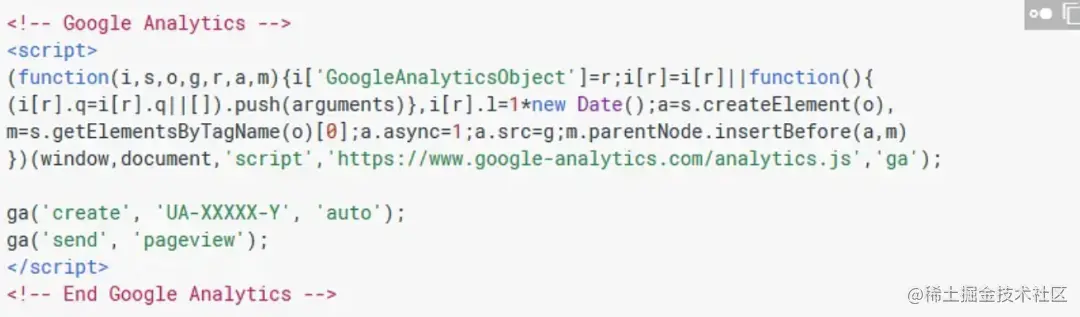 埋点的实现原理,对于产品经理来说只要知道是通过植入代码实现的,如下是Google analysis 的埋点方式