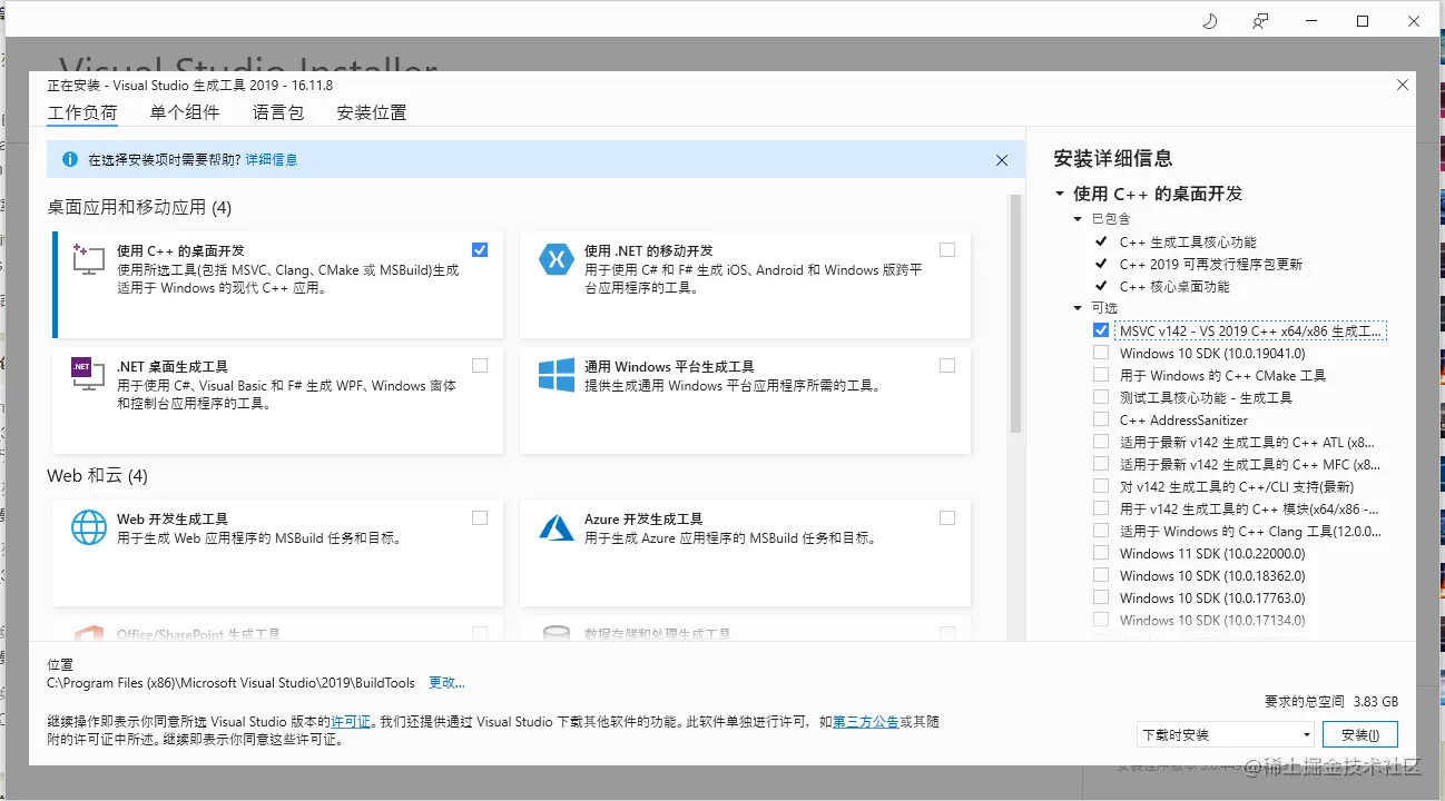 rustup安装过程中需要安装“Microsoft C++生成工具”。