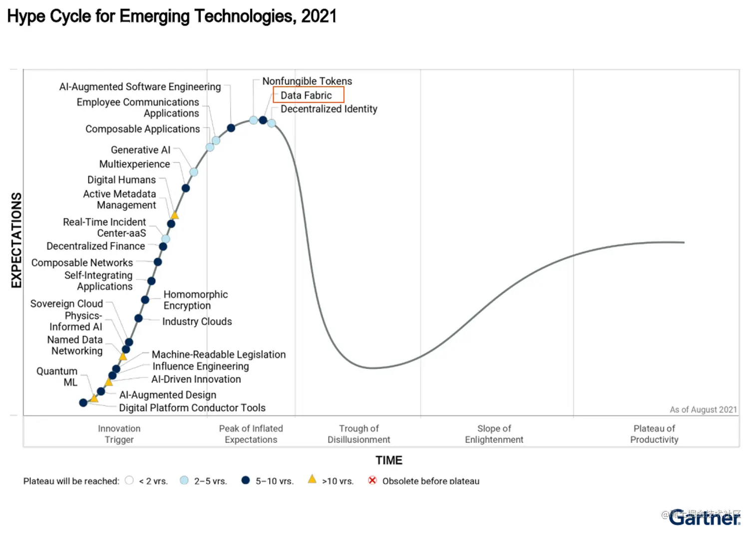 参考Gartner发布的2021年新兴技术曲线来看,目前Data Fabric正处在泡沫的顶峰,未来3-5年中将随着实验和实施失败,人们的兴趣逐渐减弱。该领域的技术创新者将被抛弃或失败。只有幸存的提供商改进产品,使早期采用者满意,投资才会继续,当然这个3-5年中确实我们这些数据从业者需要专注客户场景,不断打磨技术和产品的过程,希望未来的Data Fabric早日走到稳步爬升的复苏期,真正从逻辑上实现数据使用者和数据源之间的任意连接,让广大的中小企业也能享受技术的红利。