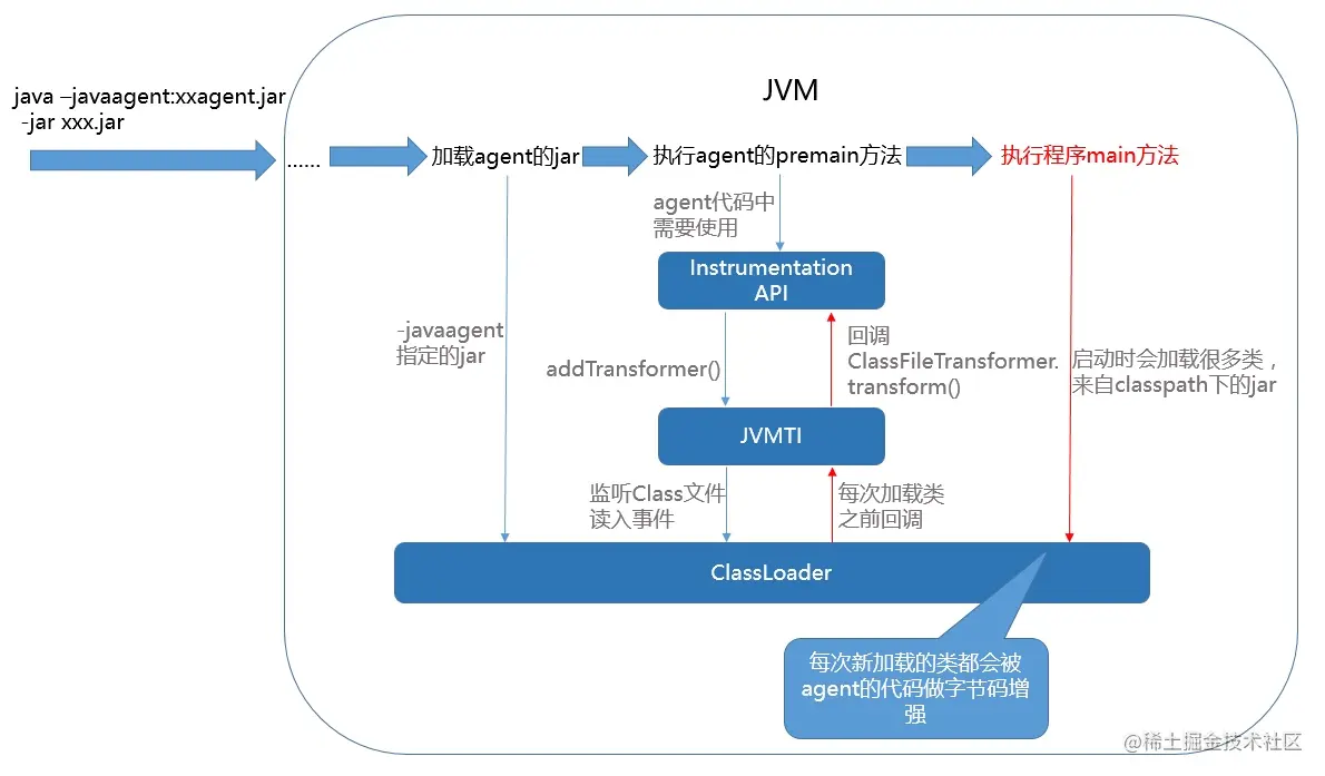 Java Agent支持目标JVM启动时加载,也支持在目标JVM运行时加载,这两种不同的加载模式会使用不同的入口函数,如果需要在目标JVM启动的同时加载Agent,那么可以选择实现下面的方法: