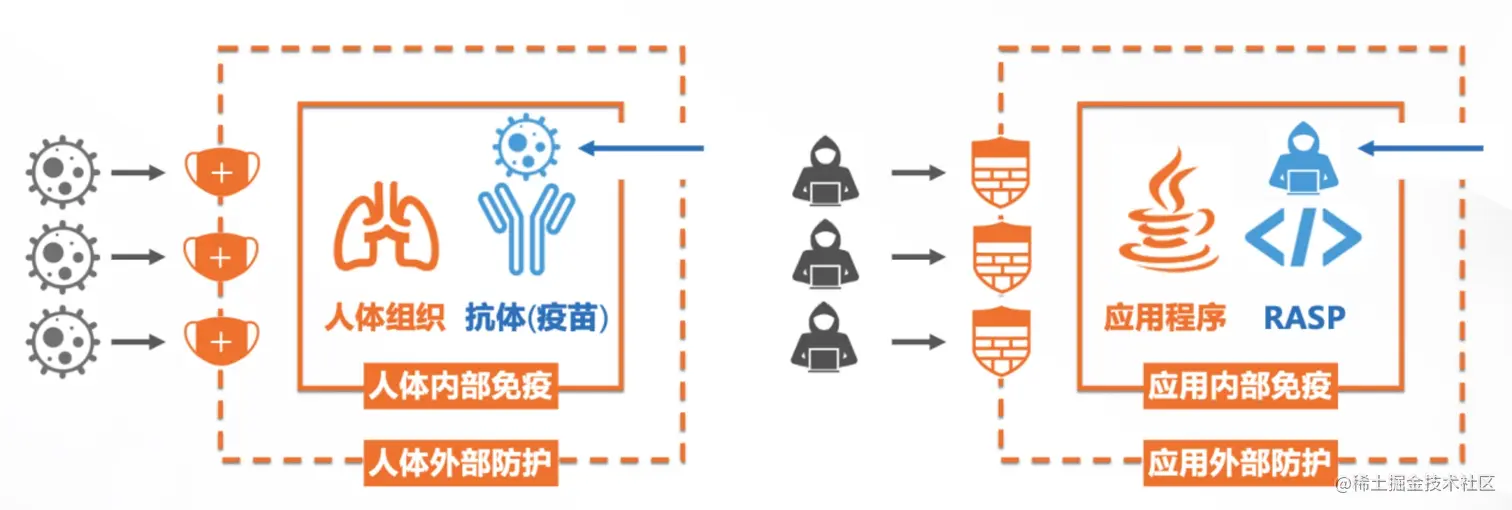 但是,RASP 则不同,他就像疫苗会注入到人体一样,RASP 是运行在应用之中的,与应用融为一体,可以获取到应用运行时的上下文,根据请求上下文进行拦截可以对攻击进行精准的识别和拦截。
