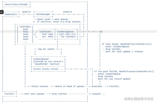 - 从请求 SequenceReq 获取 Latch 保证没有 req 冲突并检查内存 locktable,如果有冲突则释放 latch 后等待对应锁