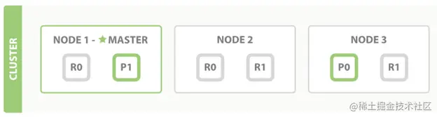 为了我们后面的解释方便,先假设相关的cluster结构如下图所示,也就是说整个cluster由三个node组成,然后有两个primary的shards,每一个primary的shard有两个replica。