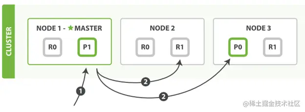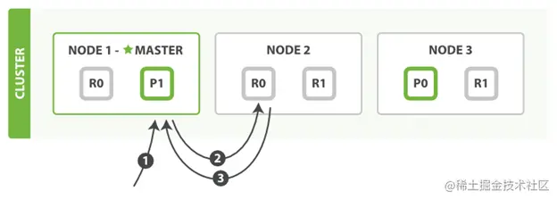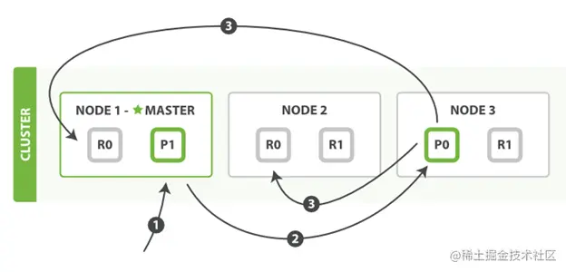 - Node1会根据文本的id来计算属于哪个shard,假设我们计算后发现这个文本属于shard0,它会把相应的请求指向shard0 primary所在的node,也就是node3.