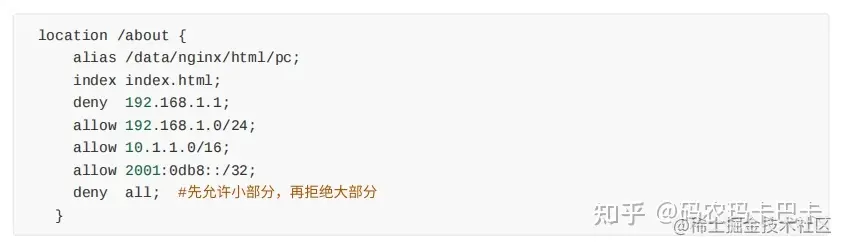 访问控制基于模块ngx_http_access_module实现,可以通过匹配客⼾端源IP地址进⾏限制。