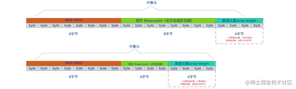 - 64位开启指针压缩的情况下,存放Class指针的空间大小是4字节,MarkWord是8字节,对象头为12字节。 数组长度4字节+数组对象头8字节(对象引用4字节(未开启指针压缩的64位为8字节)+数组markword为4字节(64位未开启指针压缩的为8字节))+对齐4=16字节。