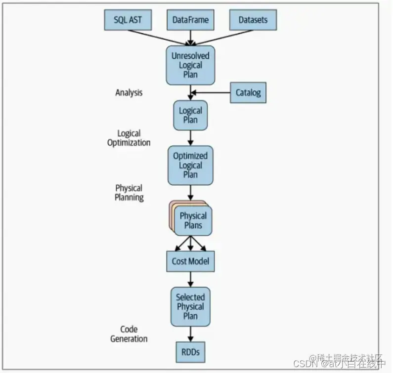 Spark SQL引擎首先会为SQL或DataFrame查询生成一个抽象语法树(AST)。在此初始阶段,任何列或表名都将会被解析为内部的Catalog,catalog是一个指向Spark SQL的编程接口,该接口包含列、数据类型、函数、表、数据库、列名等等的列表。一旦全部成功解决,查询将继续进入下一阶段。