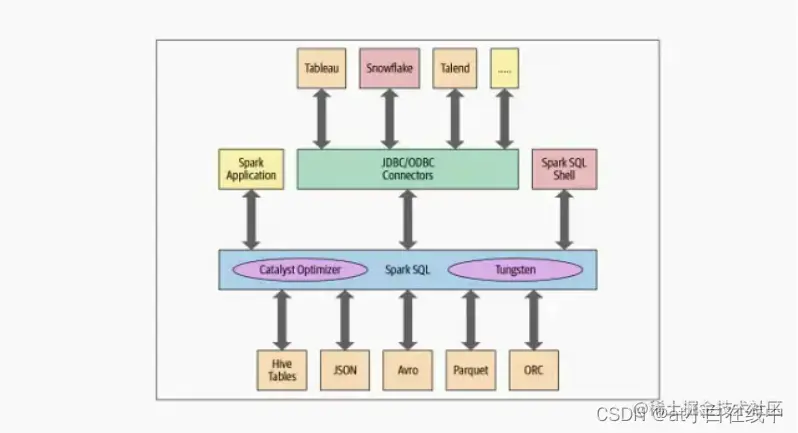 Spark SQL引擎的核心是Catalyst优化器和Project Tungsten。它们一起支持高级DataFrame、Dataset API和SQL查询。