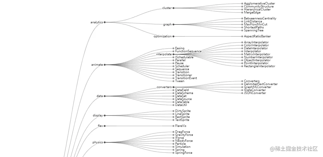 官方解释:The tree layout produces tidy node-link diagrams of trees using the Reingold–Tilford “tidy” algorithm, improved to run in linear time by Buchheim et al. Tidy trees are typically more compact than dendrograms.