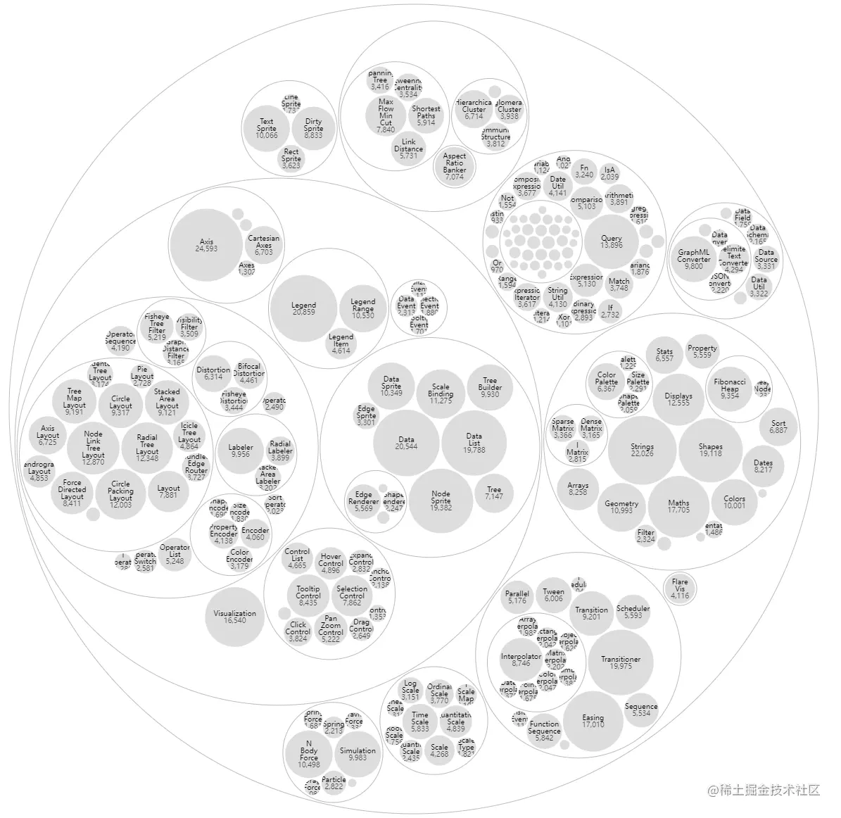 层级图对应的API,D3官方对应的集群图(Cluster)、树状图(Tree)、矩形树状图(TreeMap)、分区图(Partition)、打包图(Pack)由层级图(Hierarchy)延伸出来的。