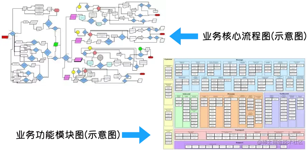 回到当下业务本身,对我而言也是全新的,在最初接触的时候凭仅有的行业背景去理解,结合了大量的文档阅读最终产出了如下图示的《业务核心流程图》和《业务功能模块图》。这两张图基本上就涵盖了所有的业务内容。左边的业务流程图得到了这个行业 20 多年从业经验专家认可,他认为这就是 20 多年所从事的业务内容。