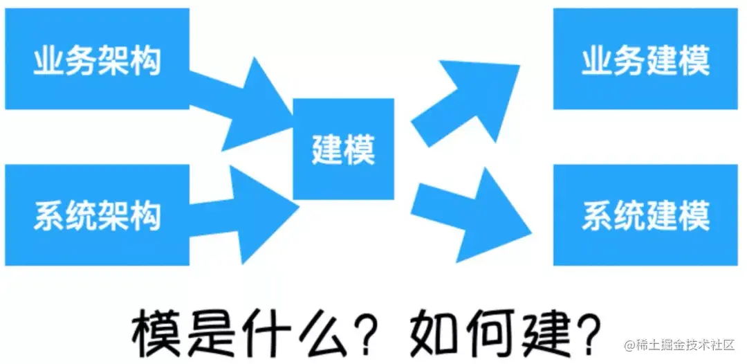 从上述两个定义上基本可以了解到建模就是抽象,对业务或现实世界的抽象,虽然不足以帮我们理解架构本身,但是可以将我们上述关注的业务架构和系统架构进一步向下 Down 一层,架构的过程是建模的过程,我们转换成两个简单的问题:模是什么?如何建?