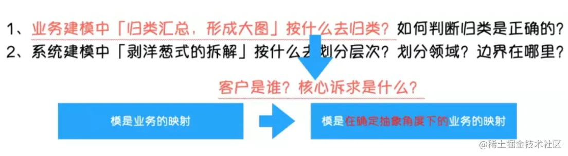 **如何建?**上面通过业务建模和系统建模两个维度,从个人实践角度大概讲了常规的套路,建模的本质其实一个抽象的过程,但是上述业务和系统建模抽象的过程其实还有两个问题并没有完全说清楚: