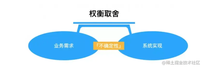 无论是何种变化,在我看来架构都是在不断的判断和取舍,在业务需求和系统实现之间做权衡,从而来应对未来变化的不确定性,如下图可以比较粗浅直观的表达这种理解。