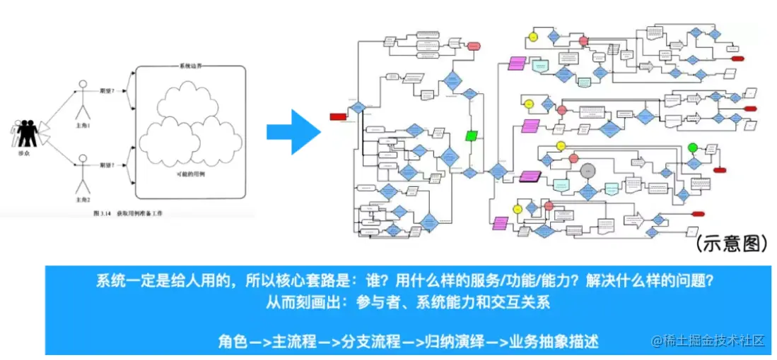 这个时候的重点是建立“大局观”,尝试梳理自己的逻辑主线,常规逻辑上讲都会划分为横纵,或者矩阵式的框架,当然这需要建立在前期的理解和分析上,**这里常常隐含一个最最重要的假设:系统一定是给人用的,一定是解决客户问题的,否则毫无存在的意义。所以核心的套路是:谁?用什么样的服务/功能/能力?解决什么样的问题?从而刻画出:参与者角色、系统能力、交互关系,需要常常问自己的是:边界是什么?输入输出是什么?**逐步的通过用例来梳理出业务功能,形成角色—>主流程—>分支流程,进而通过不断的归纳演绎形成最终的业务抽象描述“一张图”。