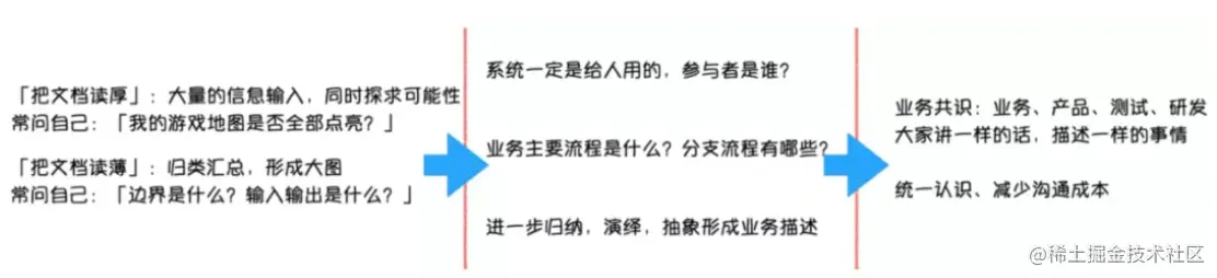 这是一个闭环封装的过程,把前期“读厚”过程中的记录,一些逻辑细节、关键流程都要逐一放到大图里去对照验证,确保业务理解的完整性和准确性,确保业务抽象能够覆盖所有已知的业务用例,甚至能够支持可能的业务场景。这个环节也是必不可少的部分。