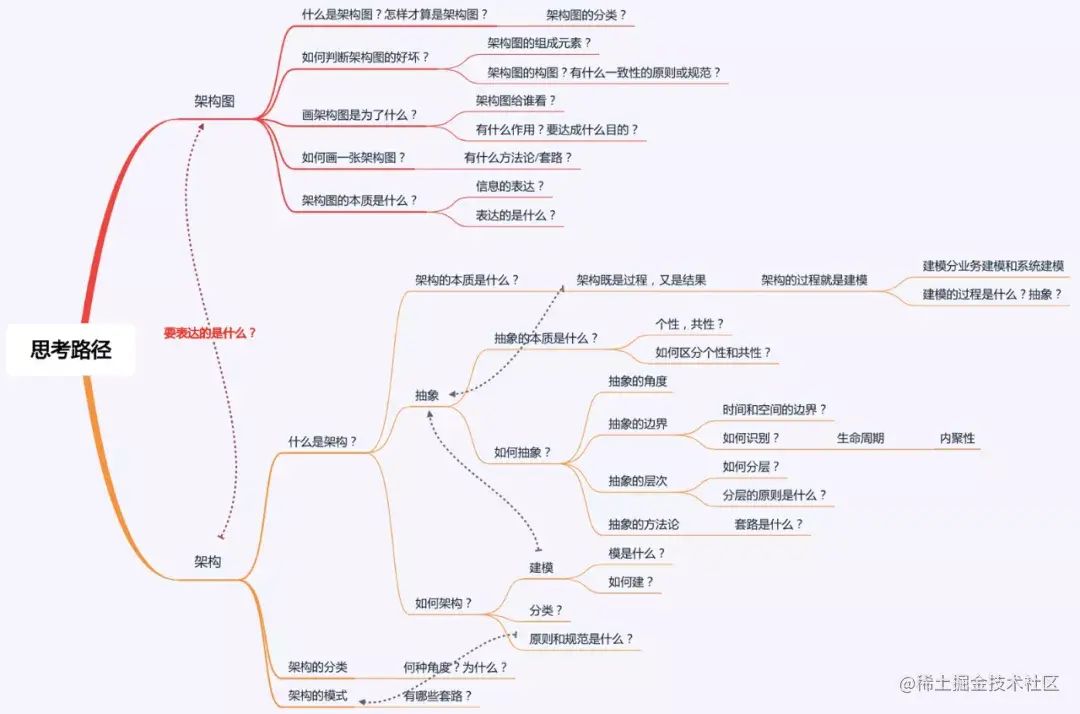 回到主题,如果上边的问题说清楚了,接下来的事情就相对简单了。对于架构图是什么这个问题,我们可以把之前的等式进行延展:**架构图 = 架构的表达 = 架构在不同抽象角度和不同抽象层次的表达,这是一个自然而然的过程。**不是先有图再有业务流程、系统设计和领域模型等,而是相反,用图来表达抽象的思考和内容。