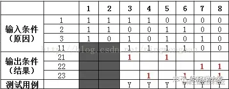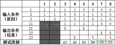 3)判定表法:因果图方法最终生成的就是判定表。一般可以根据因果图画出判定表,判定表里只有0,1两个数字。若输入条件有n个,则用例考虑的情况有2n种。判断表如下: