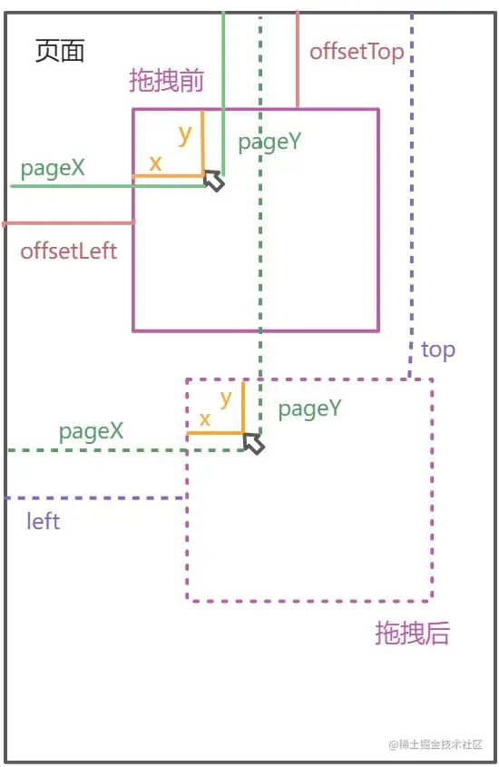 原理: 使用鼠标在页面中的坐标(pageX,pageY) - 盒子在页面中的偏移量(offsetLeft,offsetTop)