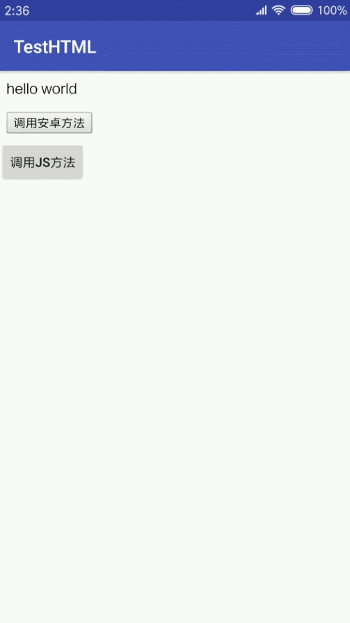 其中“调用安卓方法”按钮是html中的按钮;“调用JS方法”按钮是app中的按钮。