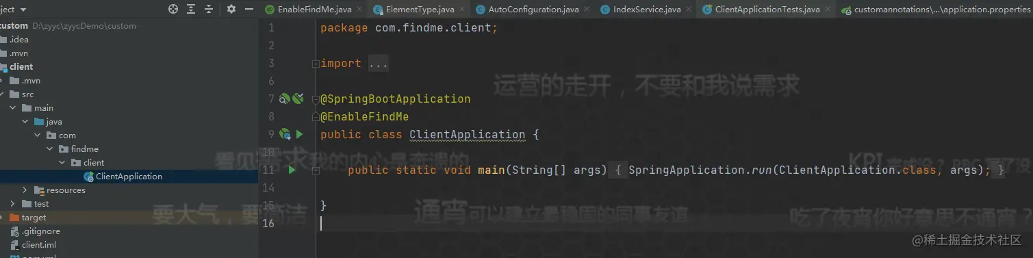 当然是我自创的注解,但是,大家先别关闭这篇文章 这不是一个普通的自定义注解, 不知道大家看到@Enablexxxx有没有很熟悉的感觉,例如: @EnableDiscoveryClient @EnableTransactionManagement @EnableCircuitBreaker @EnableFeignClients 这些注解大家应该还比较熟悉吧,都是在开发微服务项目的时候,在启动类上常用的注解 ,他们的服务使用这些 注解提供了很多丰富的功能 ,那我们是不是也可以使用这样的形式提供丰富的功能呢 ,