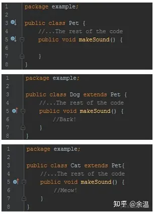 多态性允许定义某种动作,并可能有多种方式来执行该动作。例如,我们都知道狗吠,猫喵。但是,如果我们决定在Dog类中实现bark()方法并在Cat类中实现meow()方法,则程序将始终必须检查它正在处理的宠物类型以发出声音。多态允许我们在Pet超类中定义makeSound()方法,并在子类中定义不同的行为。