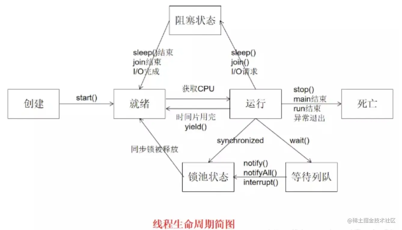 3、**其他阻塞:**运行的线程执行sleep()或join()方法,或者发出了I/O请求时,JVM会把该线程置为阻塞状态。当sleep()状态超时、join()等待线程终止或者超时、或者I/O处理完毕时,线程重新转入就绪状态。(注意,sleep是不会释放持有的锁)