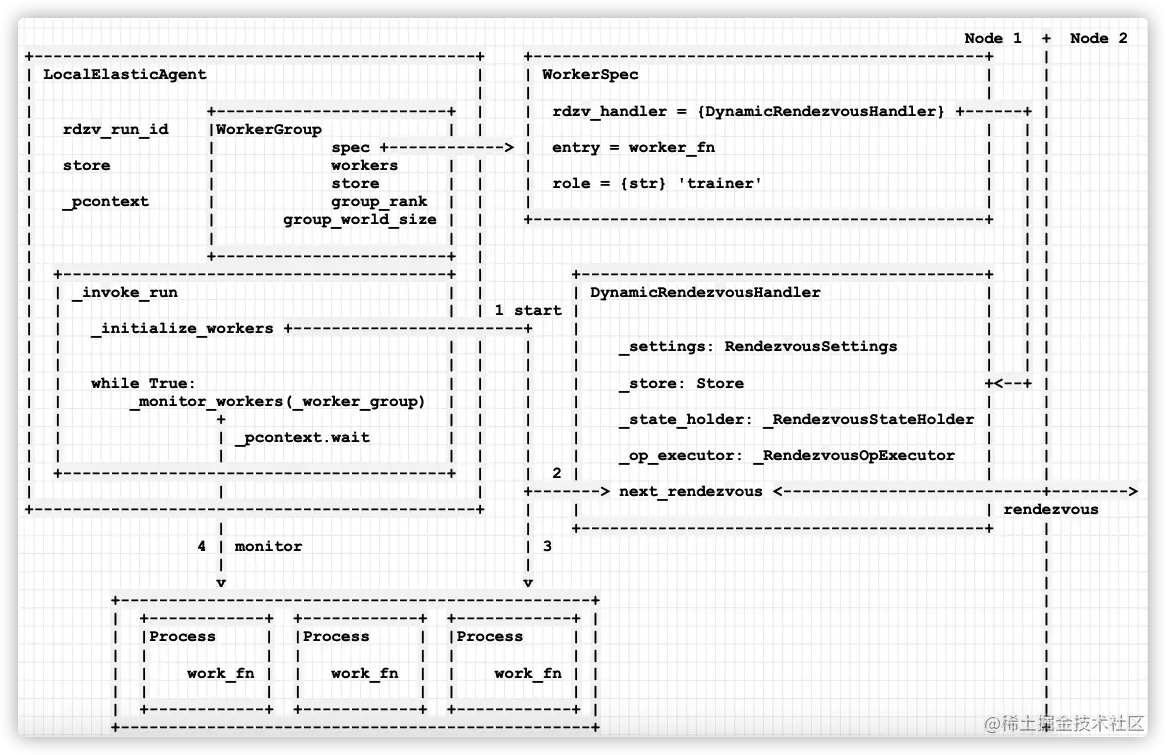 我们首先从 Node 集群角度看看,可以认为是从上到下来鸟瞰弹性系统。在这种视角下,每个Node 上运行一个 Agent,Agent之中包含一个 rendezous,负责分布式协商,Agent 同时负责启动workers,监控 workers。
