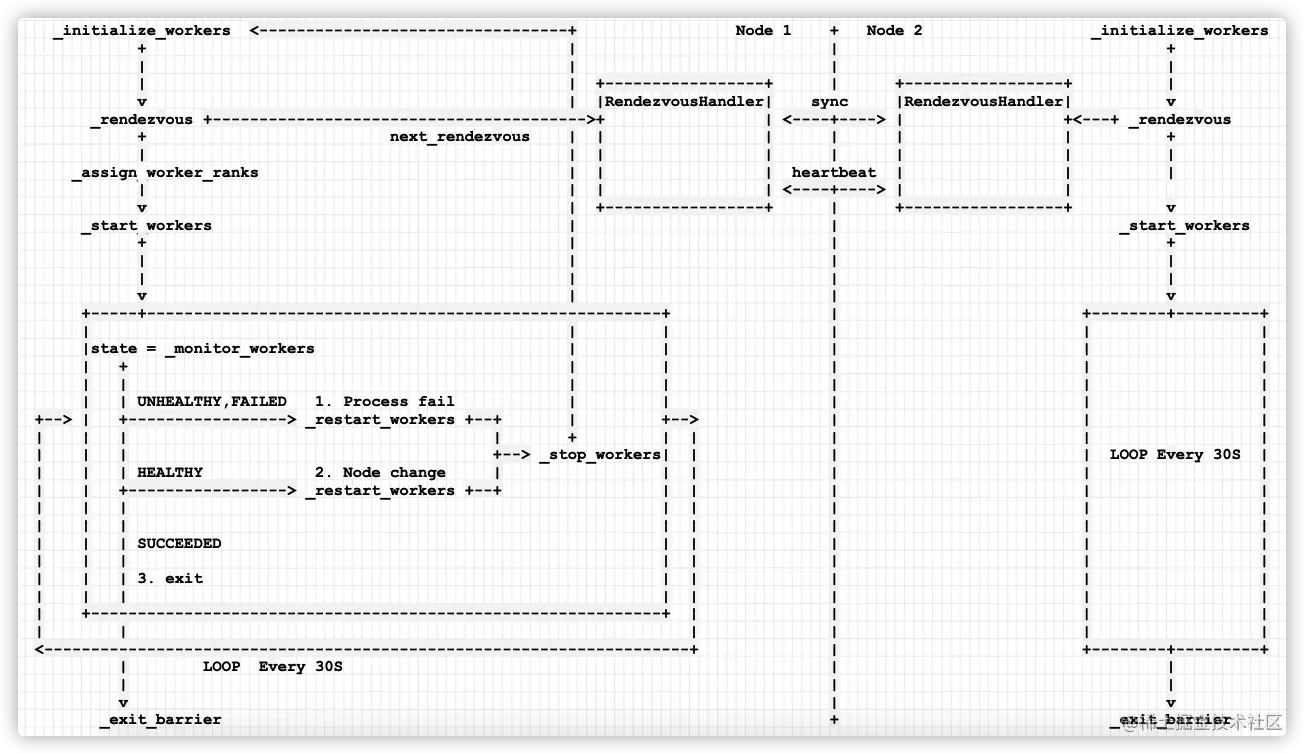 弹性训练最核心的就是监控/动态处理,所以我们深入到监控模块内部进行分析。从监控的角度看,代理 Agent 主循环 _invoke_run 具体逻辑如下: