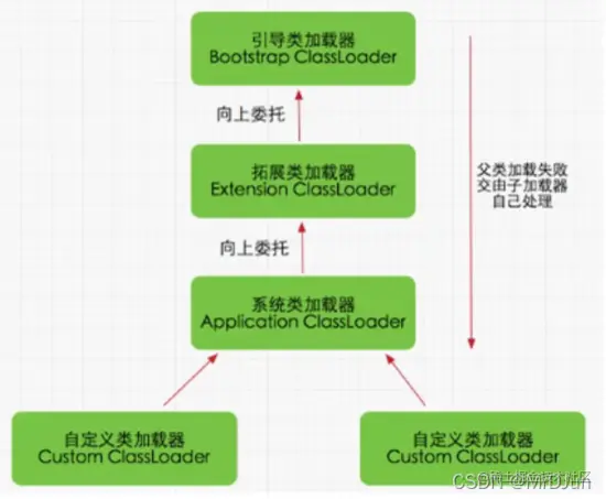 1、如果一个类加载器收到了类加载请求,它并不会自己先去加载,而是把这个请求委托给父类的加载器去执行。