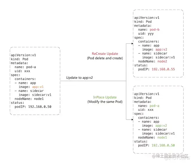 如上图所示,原地升级过程中只修改了 Pod 中的字段,因此: