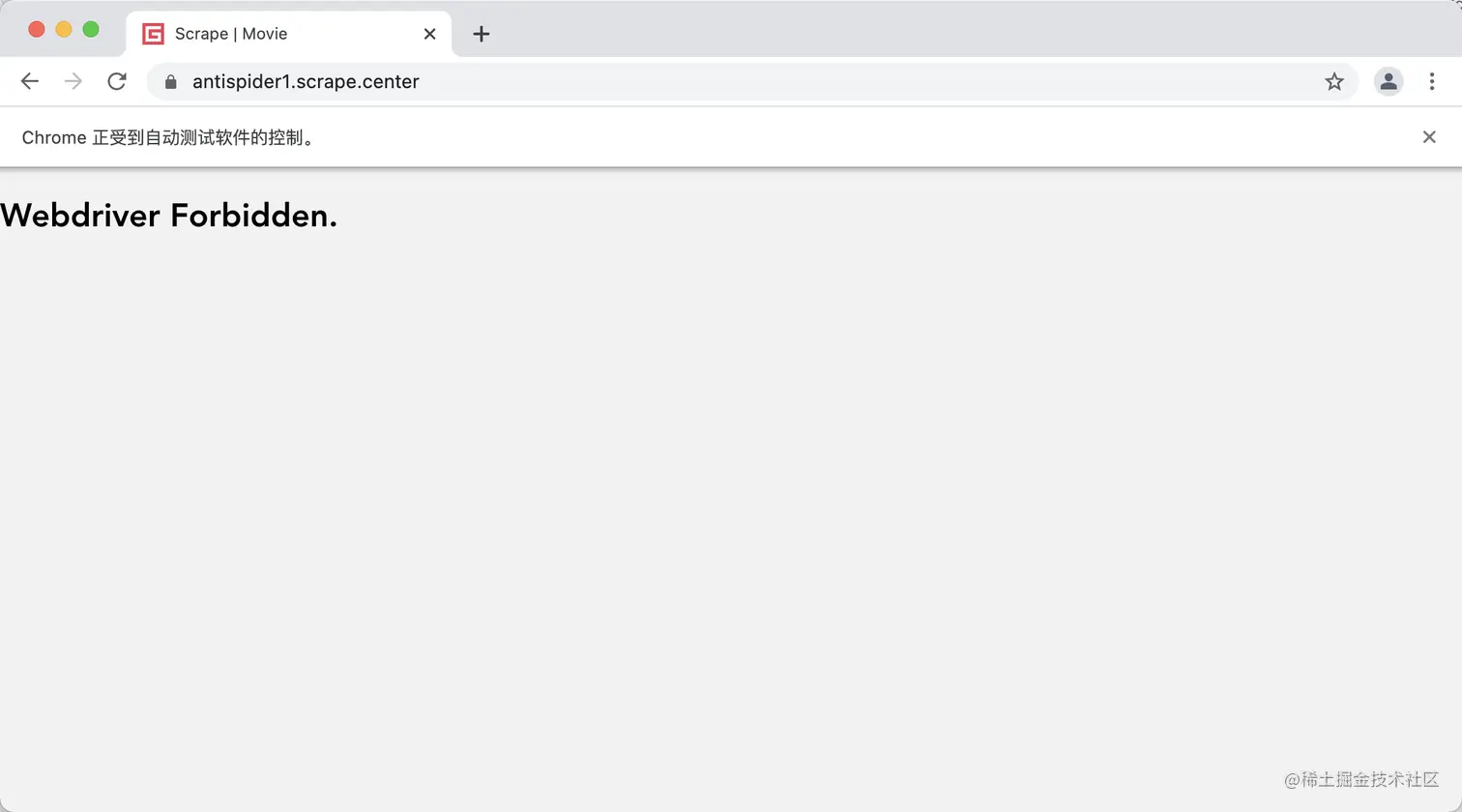 比如这里我有一个网站 antispider1.scrape.center,这个网站的内容是必须经过 JavaScript 渲染才显示出来的,同时这个网站检测 WebDriver 特性,正常情况下用 Selenium、Pyppeteer、Playwright 爬取会被 Ban 掉,如图所示:
