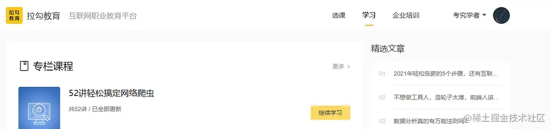 自己能够独立写出相关的爬虫项目到因为它找到了第一份爬虫的工作,可以说这本书有着举足轻重的位置。从书籍学习完以后,又买了崔大在拉钩的52讲,上面在第一版书的基础上又增加了新的内容,有兴趣的同学可以看看。