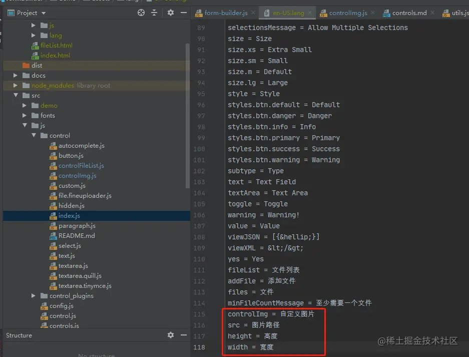 - 多语言文件,根据自己的语言环境进行设置。在demo/assets/lang文件夹下 。在设置自定义控件后,该自定义控件的名称,属性,都是自己定义的,如果不在多语言文件中提前定义,则在预览视图就看不到自定义控件的名称,属性名