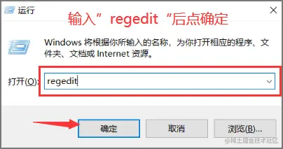 2.在“打开”右侧框内输入“regedit”并按下回车键或者点击确定;