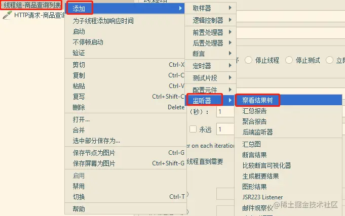 配置完接口后,想要查看实际接口参数请求和返回结果,需配置察看结果树,鼠标右键->添加->监听器->察看结果树
