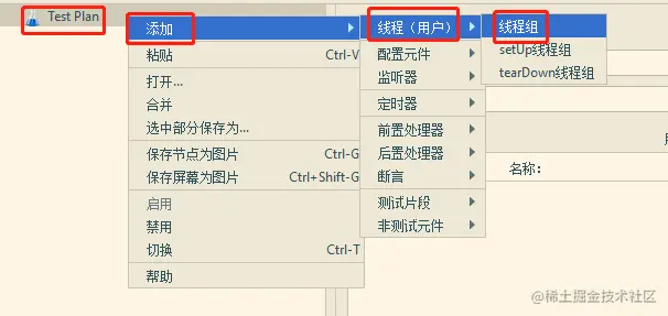 这里简单说下常用的,窗口左边树跟为 Test Plan(测试计划)