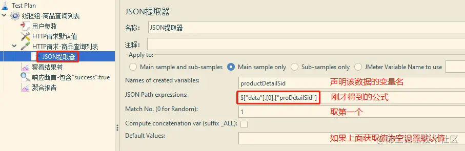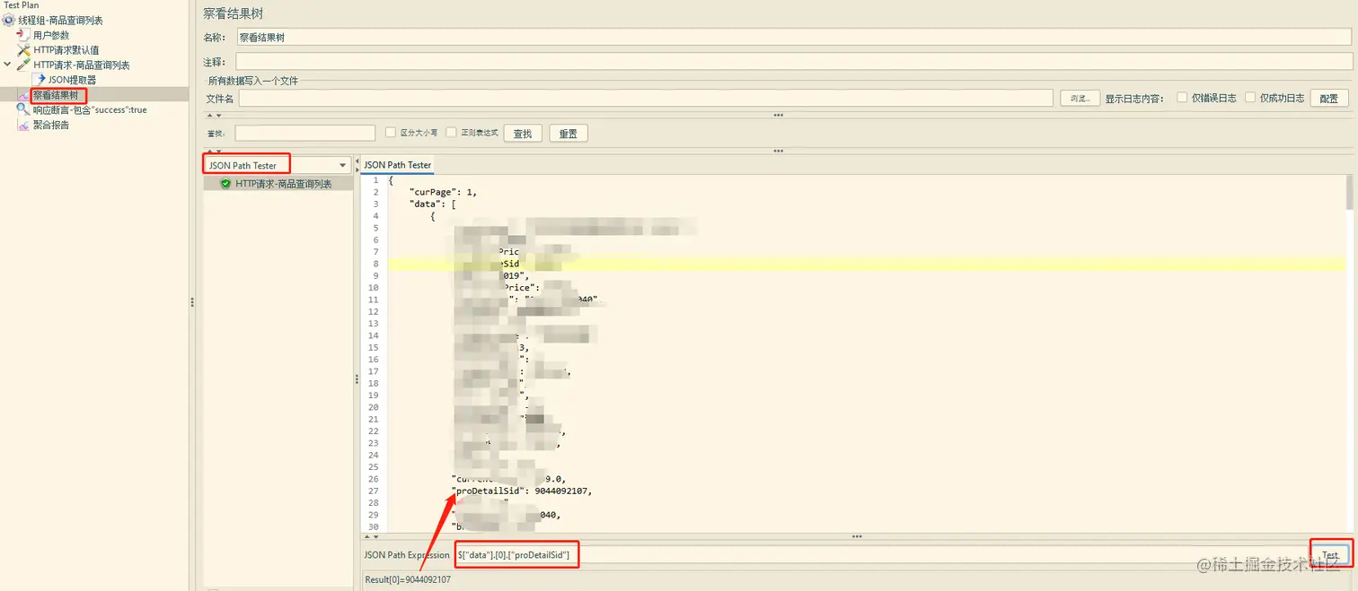 先启动线程组,察看结果树,使用 JSON 格式,测试数据获取公式