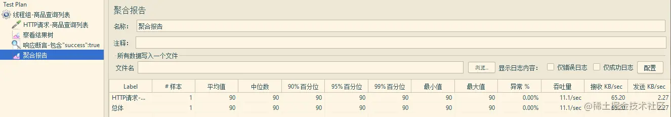 重新启动线程组,察看聚合报告结果,时间单位为毫秒。