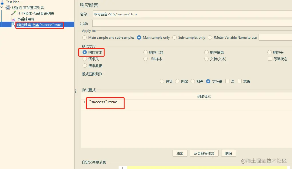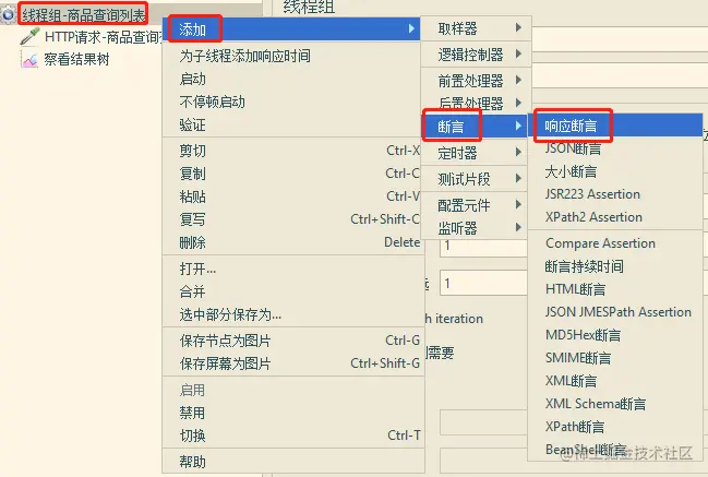 对返回的结果做校验来判断接口是否请求成功能,鼠标右键->添加->断言->响应断言