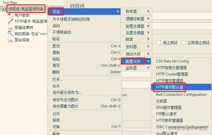 主要配置请求服务器的常量参数,鼠标右键->添加->配置元件->HTTP 请求默认值