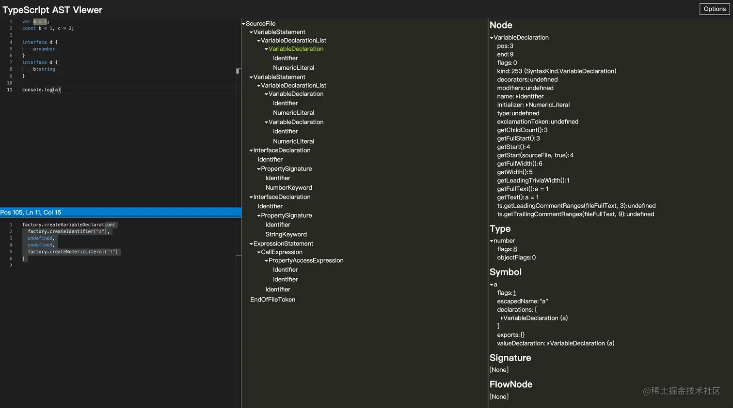 TS compiler内部是将token的所有类型枚举出来了,在type.ts中可以找到,使用 SyntaxKind 存储标记类型(SyntaxKind 本质是numebr,比较起来性能更高)。
