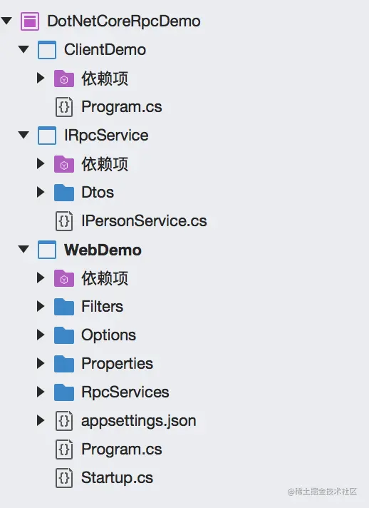 打开Visual Studio先新建一个RPC契约接口层,这里我起的名字叫IRpcService。然后新建一个Client层(可以是任何可承载.Net Core的宿主程序)叫ClientDemo,然后建立一个Server层(必须是Asp.Net Core项目)叫WebDemo,文末附本文Demo连接,建完这些之后项目结构如下: