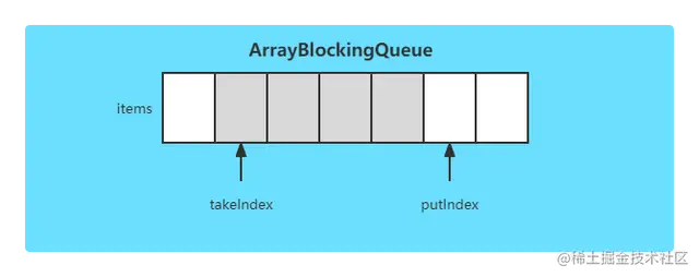 相关的成员变量反应到结构图如下,ArrayBlockingQueue的内部数组items是在构造函数就创建好的,并且长度是固定不变的,它通过改变takeIndex、putIndex和count来表示队列中的状态。比如下图中队列内元素数量count为4(灰色部分)。