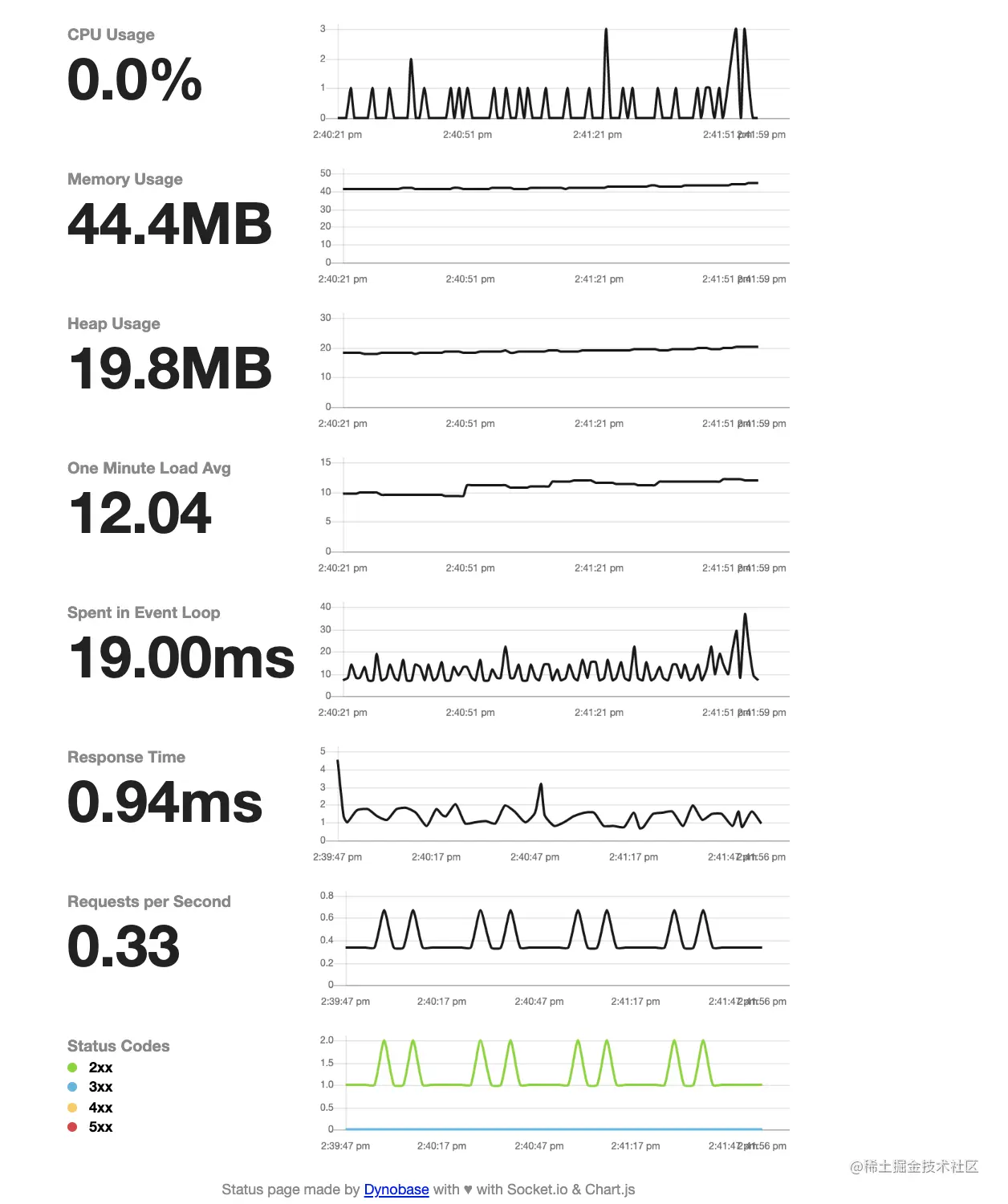 一个完善node服务的性能指标不仅仅只有内存这一项,还包括cpu利用率、相应时间、状态码监控等。这些线上的服务,社区内也有很多好用的工具,推荐一个非常简单好用的监控工具express-status-monitor, 这个工具引入到工程后,通过默认路由(/status)或者指定的路由既可以访问各项指标的实时监控