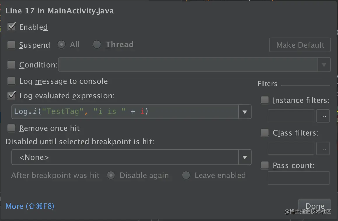 如果你知道日志断点,就不用如此大费周折,费时费力了。还是右键点击断点,在弹出的窗口中取消勾选Suspeng复选框(即表示程序运行至此断点时不会停下来供开发者调试),然后勾选Log evaluated expression:,并输入打印语句即可。这样,当Debug模式下的程序执行至此,不会停下来,而是在控制台中打印对应信息,如: