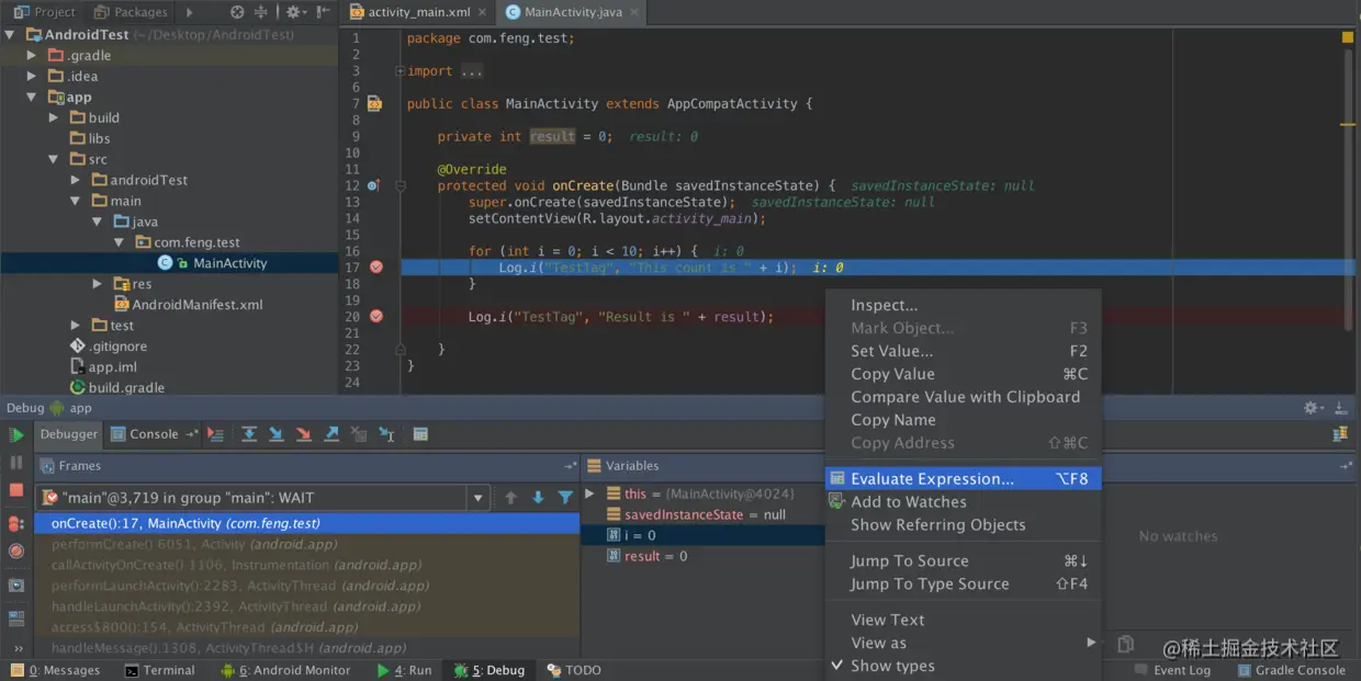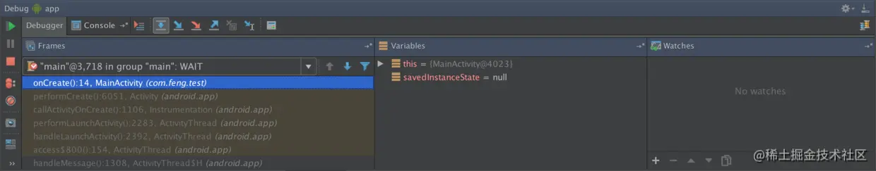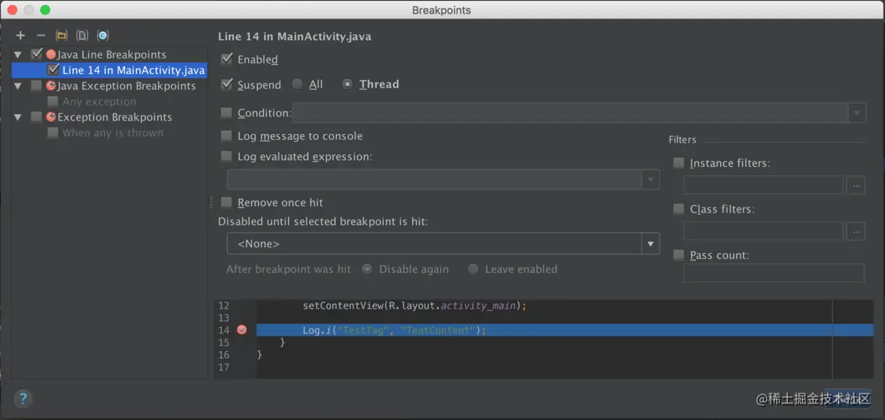 程序在执行的过程中可能会出现各种各样的未知性异常,如果能在发生异常的时候第一时间让程序停下来,并定位到异常出现的地方,供开发者调试,那当然是极好的。而万能的Android Studio就提供了这样的功能。
