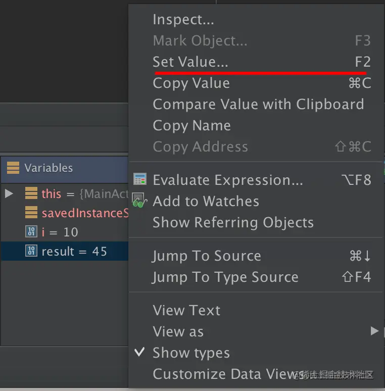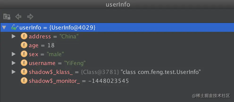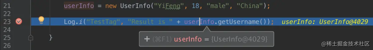 在Variables变量区和Watches观察区可以查看Debug模式下,程序执行到断点处的变量值或者对象的各属性值,但是多多少少查看起来还是有些不方便。其实可以通过弹出窗口的形式查看属性值,只要将光标定位至断点代码行所用到的变量,IDE会自动弹出一个小窗口,如下图所示,此时,使用对应的快捷键或者点击这个小窗口里的变量即可弹出变量属性值窗口,Mac下的快捷键位command + F1,如图所示: