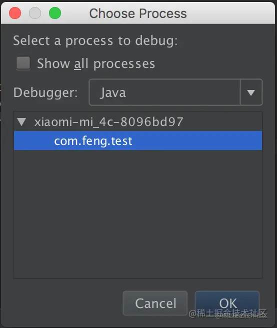 第二种就是调试当前已经处于运行状态下的App,这也是我们用的更多的一种调试手段,即Attach debugger to Android process。点击运行按钮右侧第三个按钮,弹出Choose Process窗口,选择对应的进程,点击OK按钮即可进入调试模式,此时,我们便可以在需要的地方直接下断点调试代码了: