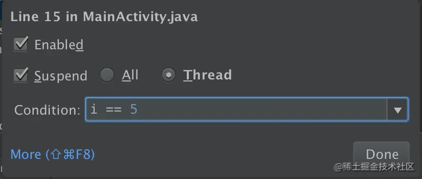 如果你知道条件断点的话,一定会悔不当初。条件断点可以满足开发人员自己输入条件,比如fori循环中输入i == 5即可让程序直接运行至第六次循环,for each循环中针对list某一元素下的断点调试。只需要右键点击断点,在弹出的窗口中输入Condiction条件,点击Done按钮,然后当程序执行到循环体时,会在满足条件的一次循环中停下来,供我们调试: